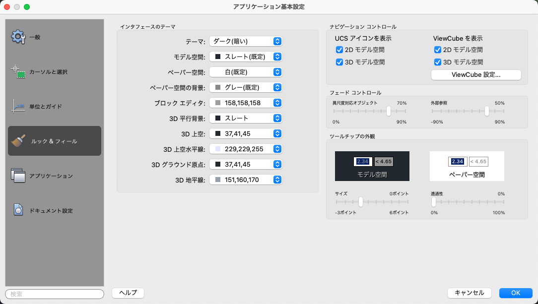 ステータス バー、パレット、図面ウィンドウなどの要素に適用するテーマをコントロールします。テーマとして、[暗い]または[明るい]を選択できます。