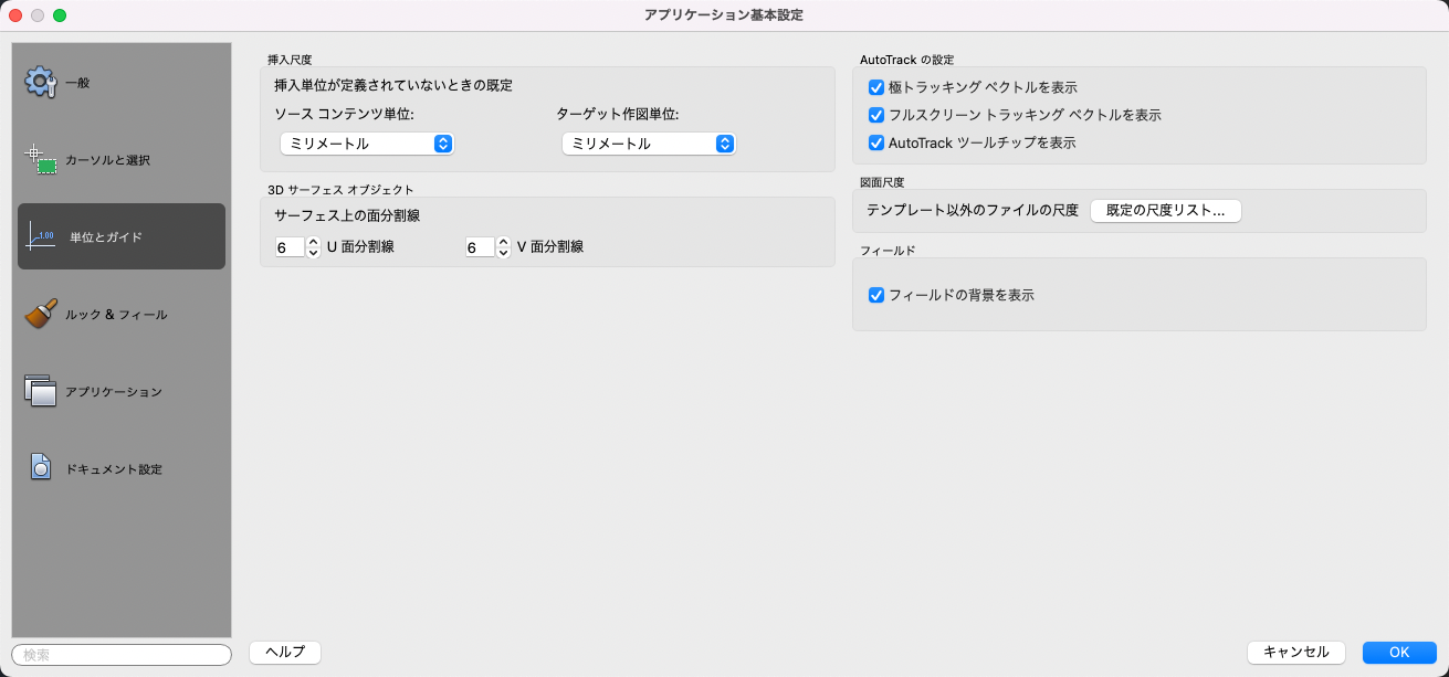 ブロックや参照オブジェクトを挿入するときに使用する単位と、どの作図ガイドを有効にするかをコントロールします。