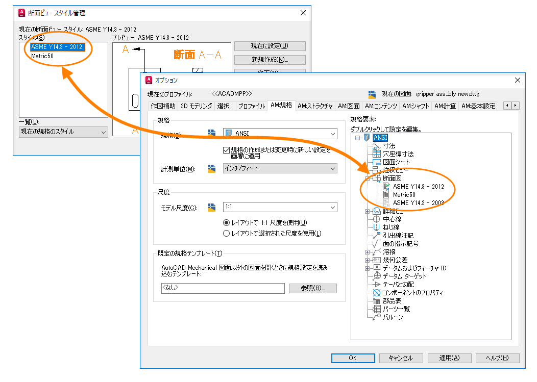 AutoCAD Mechanical ツールセット オブジェクトの外観をコントロールする設定は、製図規格と呼ばれる設定の名前の付いたコレクションに保存されます。断面ビュー スタイルは製図規格と一緒に保存され、製図規格の履歴として扱われます。