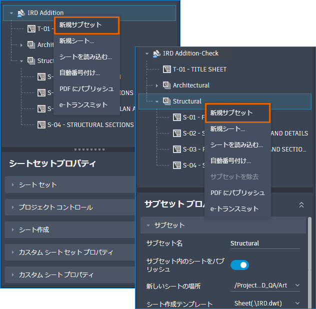 - Web 用シート セット マネージャで、シート セットのノード(リストの最上部)または既存のサブセット ノードを右クリックします。[新規サブセット]を選択します。