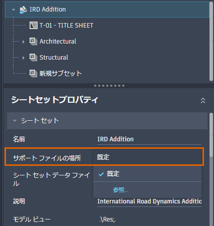 - Web 用シート セット マネージャの下部にある[シート セット プロパティ]ペインで[シート セット]を展開し、[サポート ファイルの場所]ドロップダウンをクリックします。
