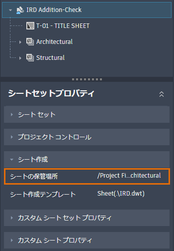 - Web 用シート セット マネージャの下部にある[シート セット プロパティ]ペインで[シート作成]を展開し、[シートの保管場所]ドロップダウンをクリックします。