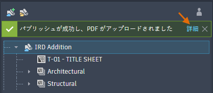 - パブリッシュ処理が完了したら、通知から[詳細]をクリックして、パブリッシュされたジョブに関するエラーや警告などの情報を表示して確認します。