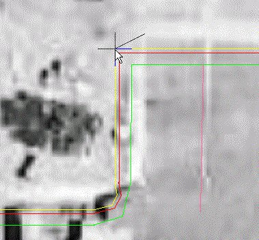 - コマンド ラインに、次の[基点]を指定するようプロンプトが表示されます。割り込みで画面移動およびズームを行って、駐車場の左下コーナーにズームします。上記の手順と同様に、基点としてイメージ内の駐車場のコーナーを指定し、目的点として黄色の境界のコーナーを指定します。
