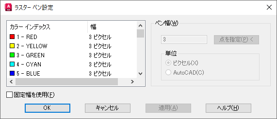 [ラスター ペン設定]ダイアログ ボックスでペンの太さを指定することにより、ベクトル合成で使用されるラスター ペンの幅を選択することができます。