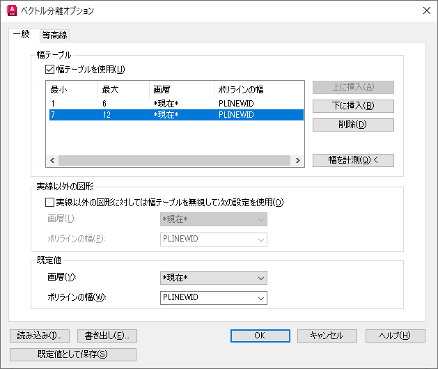 - [ベクトル分離オプション]ダイアログ ボックスの[一般]タブを使用して、ラスター線の線幅に基づいてベクトルを分離します。たとえば、太いオブジェクト線分から個別の画層へ細い寸法線を割り当てることができます。ラスター図形に対して 2 つまたはそれ以上の線幅範囲を指定し、各範囲に対して画層とポリライン幅を割り当てます。