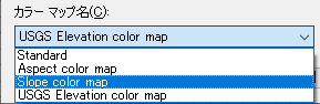 [パレット割り当てのカラー マップ]ダイアログ ボックスで、ドロップダウン リストから[Slope Color Map]を選択し、[適用]をクリックします。 これにより、マップ上のカラーが地形の勾配値の範囲を表します。 |