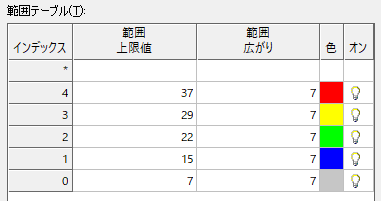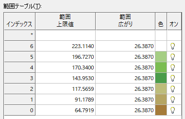 [パレットのカラー マップ定義]ダイアログ ボックスの[範囲テーブル]で、マップの各カラーが 26.387 m の高度範囲を表していることに注意してください。 [OK]をクリックしてダイアログ ボックスを閉じます。 |