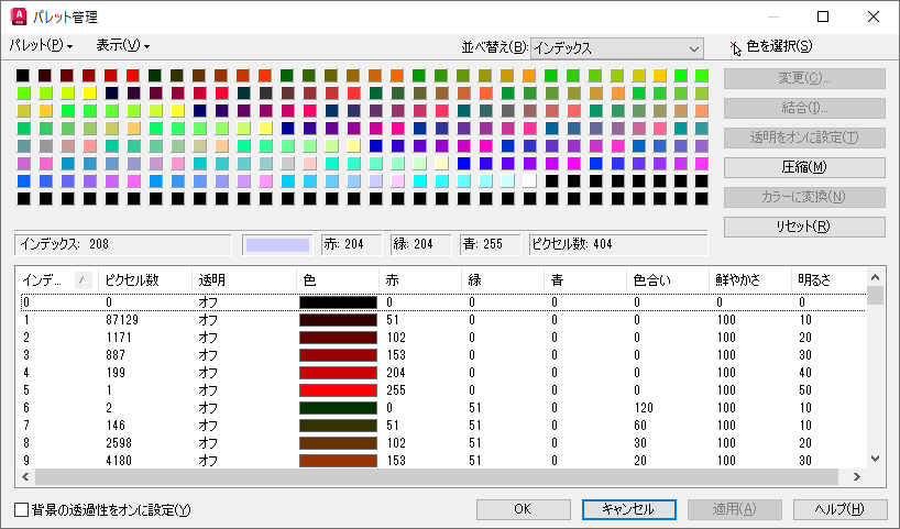 8 ビットのイメージ(256 色か階調グレー)では、パレット管理を使用して、色の変更、圧縮、結合と、背景の透過性の割り当て、またはグレースケール イメージをパレット カラー イメージに変換ができます。また、イメージ パレットを分析し、色の使用率や輝度ごとに表示することもできます。パレットの読み込みと書き出しで標準値を適用します。