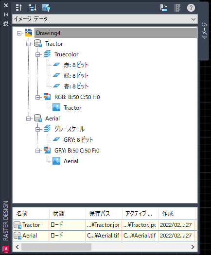 イメージ管理ツールスペースは、図面に関連付けられているイメージ データの構造を表示します。 このダイアログを使用して、イメージ ファイルの管理、その表示順序またはアクティブ パスの変更、カラー マップの編集、およびイメージの他の場所への書き出しを行うことができます。