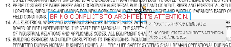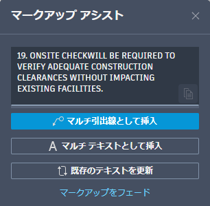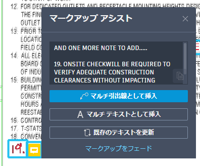 マークアップ アシストを使用すると、読み込んだマークアップに対して操作することができます。マークアップ アシストは、文字、取り消し線文字、引出線、雲マーク、命令文字、PDF コメントを識別することができます。雲マークやマルチ テキストを挿入するなど、マークアップを操作すると、トレースではなく図面にオブジェクトが追加されます。