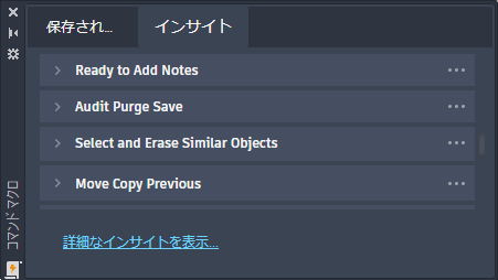 コマンド マクロには、AutoCAD での作業時に頻繁に実行するタスクを自動化するのに役立つ一連のコマンドとシステム変数が含まれています。AutoCAD は、個々のお客様のコマンドの使用状況に基づいてマクロ インサイトを生成します。[コマンド マクロ]パレットを使用して、推奨されたコマンド マクロを表示、試行、保存することができます。コマンド マクロは、[コマンド マクロ]パレットの[保存済み]タブに追加して使用したり、リボンに追加したりすることもできます。
