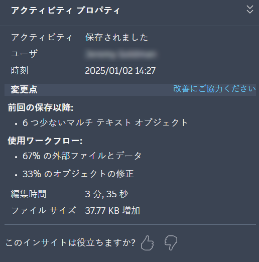 このインサイトは、各編集セッションの間に行われた変更点の概要を示します。これにより、図面で最後に作業した時点からの変更点を把握し、中断したところから作業を続行するのに役立ちます。
