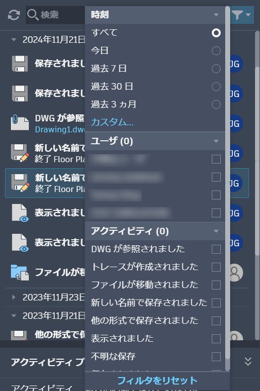 検索バーとフィルタ バーが簡素化され、使いやすくなりました。これにより、ボタン 1 つでアクティビティを時間、ユーザ、または特定のアクティビティでフィルタできるようになりました。