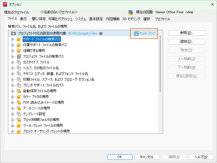 プロジェクト対応サポート ファイルを設定するには、[オプション]ダイアログ ボックスを表示し、[ファイル]タブの[セットアップ]をクリックします。