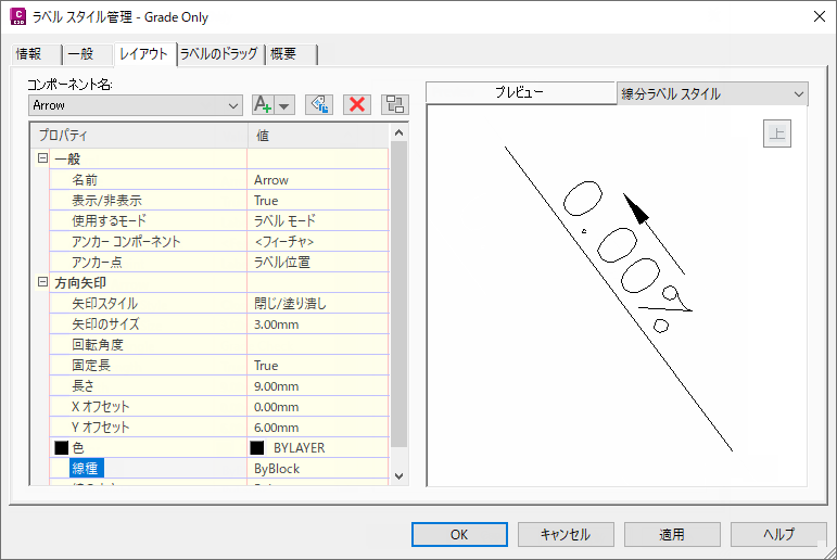 式を使用して、このラベル スタイルの方向矢印が下りグレーディング方向を示すように設定することで、さらに便利にできます。そのためには、図 6 に示すように、Grade Only スタイルの矢印コンポーネントを編集します。