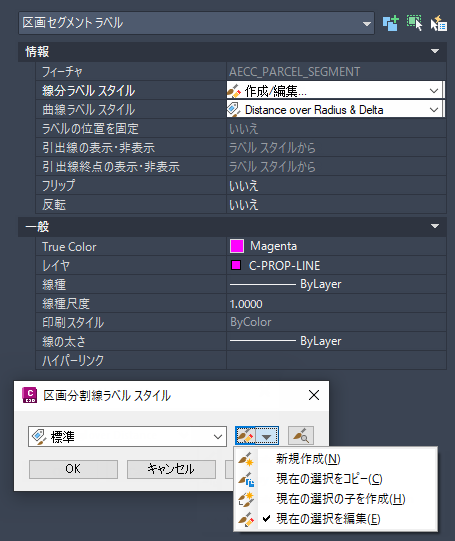 [プロパティ]パレットのスタイル プルダウン メニューから、[作成/編集] (図 13 を参照)を選択して[オブジェクト(区画分割線ラベル)スタイル]ダイアログ ボックスにアクセスします(図 14 を参照)。