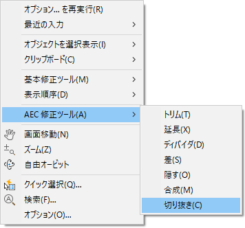 等高線ポリライン データをサーフェスに追加する前に、設計に必要ない地形モデルが組み込まれているかどうかを考慮します。組み込まれている場合、AEC 修正ツールを使用して不要な輪郭部分を削除できます。図 5 に示すように、これらのツールは、図面内のオブジェクトが選択されていないときに右クリック メニューで使用できます。