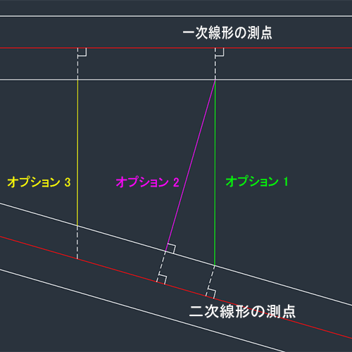 オプション 1 PrimaryAlignmentToSecondaryRail.1 次線形の左右のトラック線に垂直な線分。線分が 2 次線形の左右のトラック線と交差します。2 次線形のターゲット測点は、2 次線形上の交点の投影測点です。トラック距離は、線分が 1 次線形の左右のトラック線および 2 次線形の左右のトラック線と交差する 2 つの交点間の最小距離です。 |