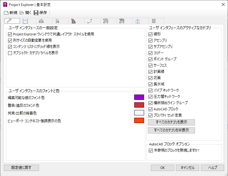 基本設定により、レポートの生成に関連しない Project Explorer ユーザ インタフェースの外観が決まります。たとえば、縦断ビューと横断ビューの色スキームと既定の尺度設定、ユーザ インタフェースのフォント設定、Project Explorer ウィンドウの個々のオブジェクト カテゴリ タブの表示/非表示とペイン レイアウトなどです。