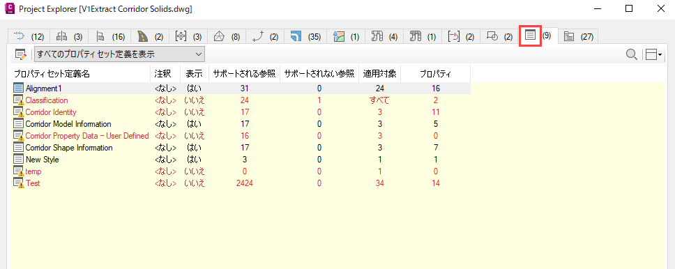 [プロパティ セット]サブオブジェクト タブは、Project Explorer でサポートされている任意のオブジェクト タブにあります。[ポイント グループ]タブ、[パイプ ネットワーク]タブ、[圧力管ネットワーク]タブの下にある[サブオブジェクト プロパティ セットを表示/非表示]ボタンをクリックすると、表示と非表示を切り替えることができます。