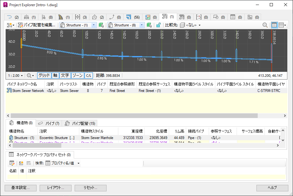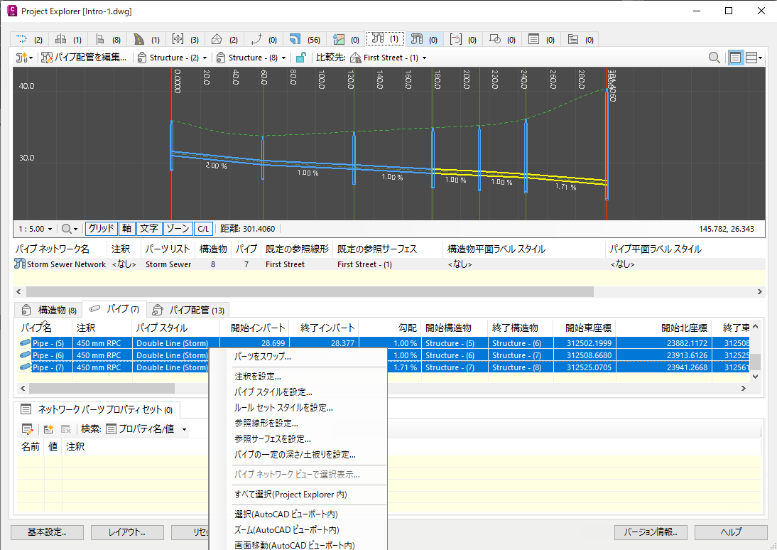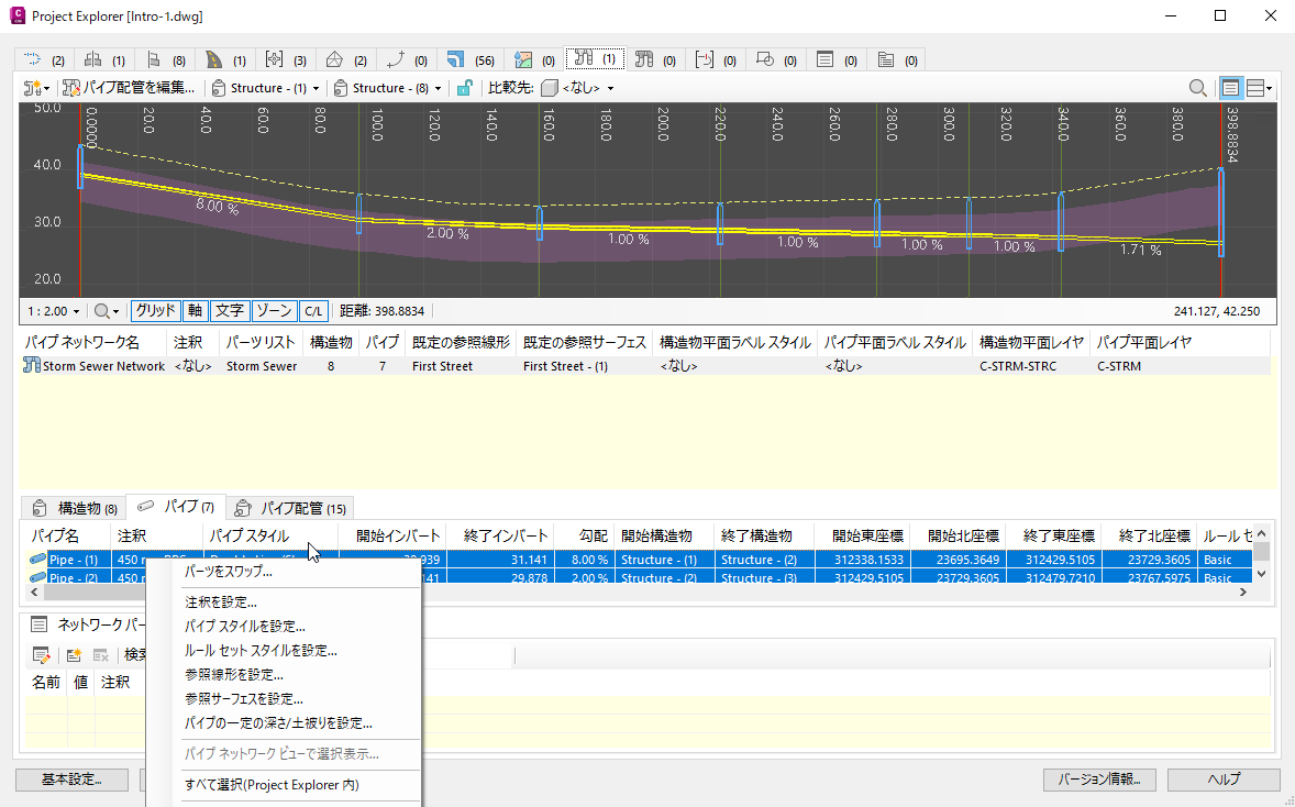 Project Explorer を使用すると、1 回の操作でパイプ配管全体の勾配を調整できます。次の操作を試してみましょう。