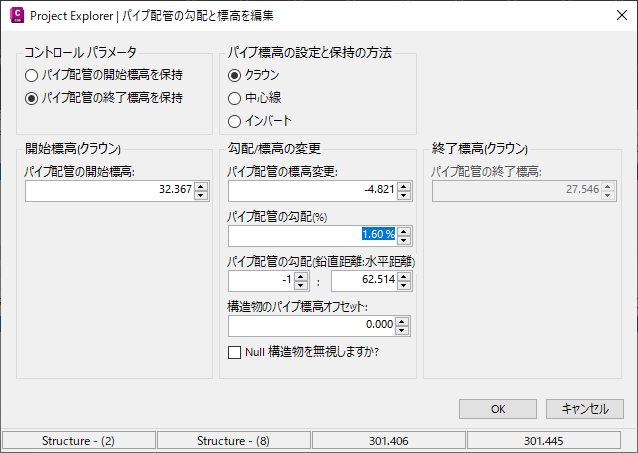 - [パイプ配管の勾配と標高を編集]ダイアログが開きます。