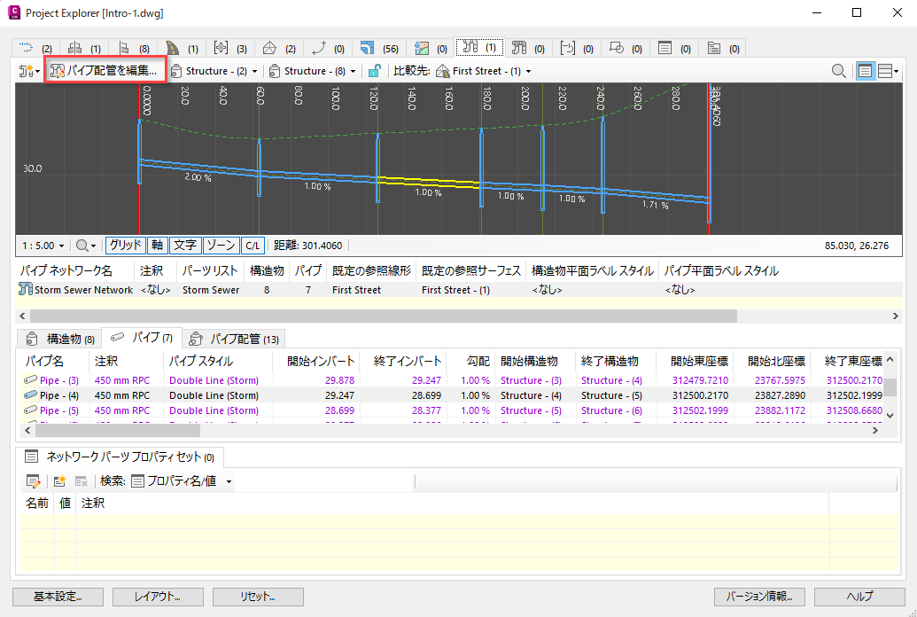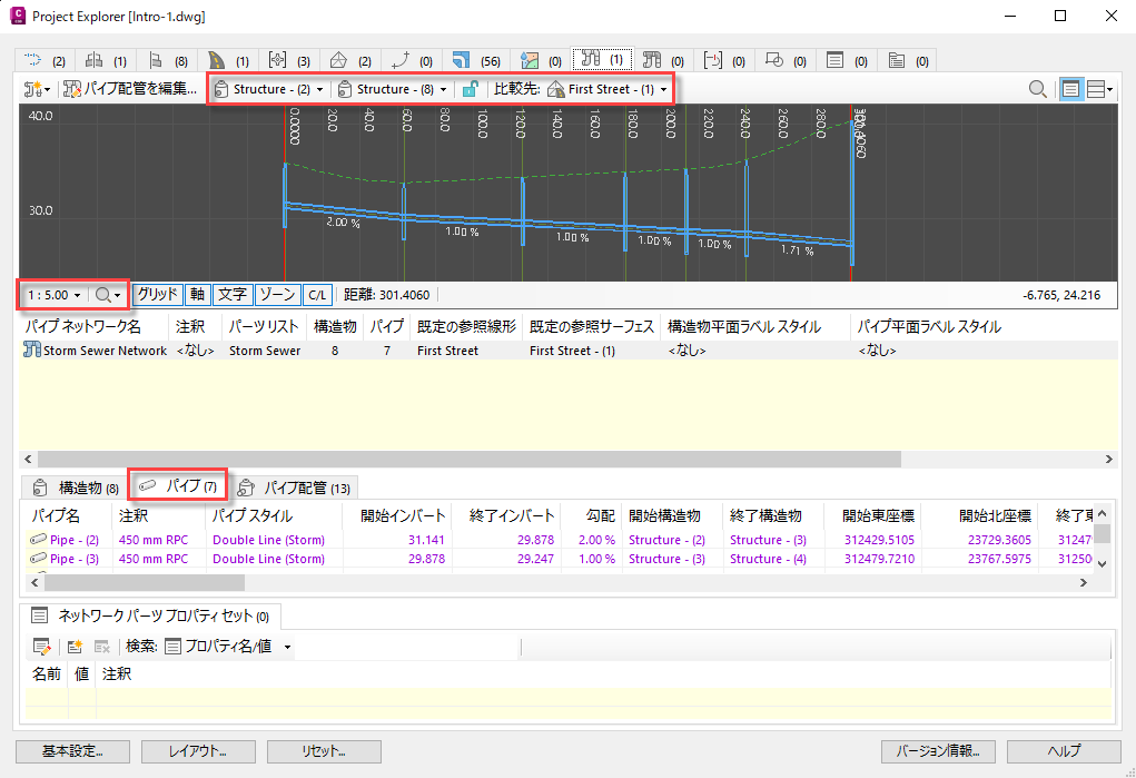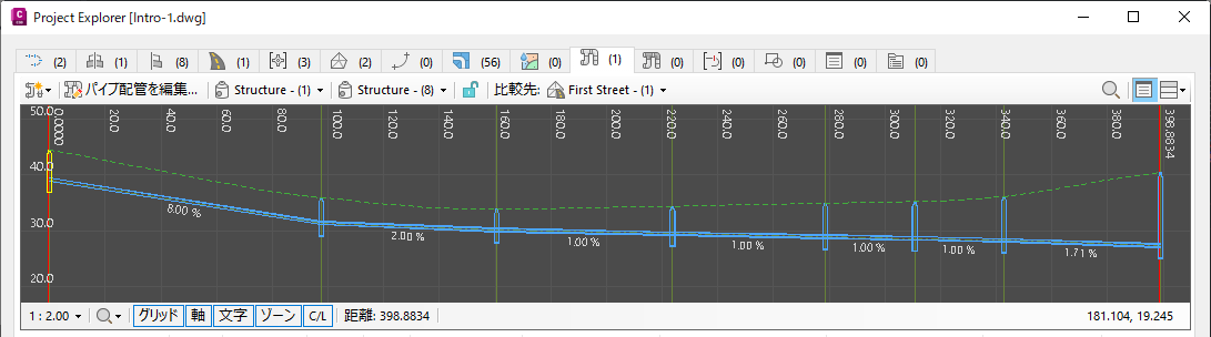- 適用するパイプ勾配の変更を確認しやすくするために、パイプ ネットワークの縦断ビューの鉛直異尺を 1:10 に変更します。