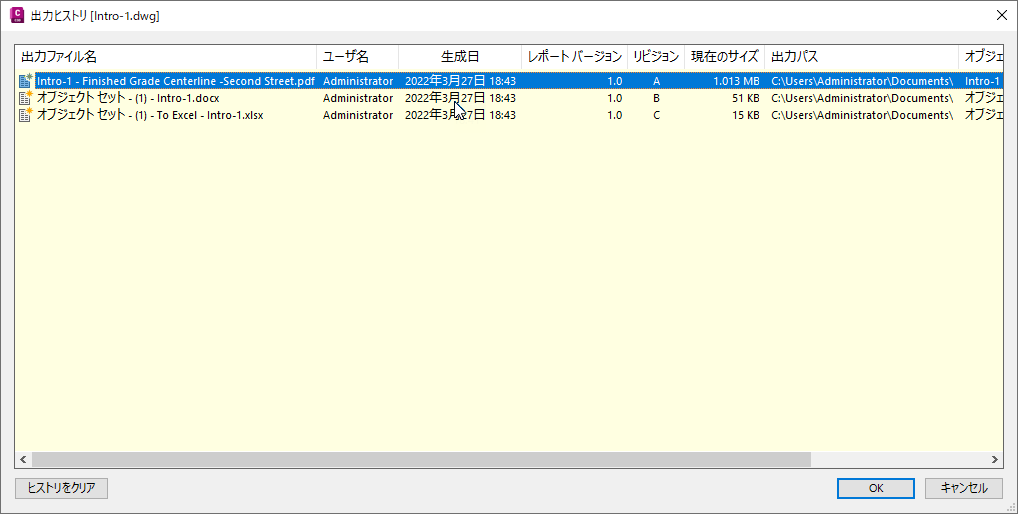 Project Explorer は、特定の AutoCAD 図面から生成されたすべてのレポートの永続的なレコードを保持します。これらのレコードは、[出力ヒストリ]ウィンドウから確認できます。このダイアログ ボックスには次の 2 つの方法でアクセスできます。