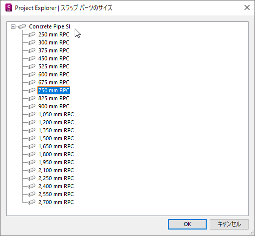 - [スワップ パーツのサイズ]ダイアログから 750mm RPC コンクリート パイプを選択し、[OK]をクリックします。