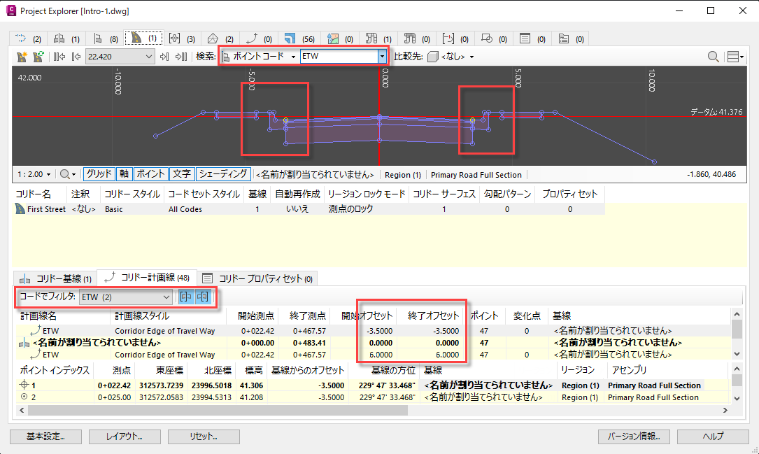 - コリドー横断ビューのツールバーで、[検索]ドロップダウン リストから[ポイント コード]を選択し、使用可能なコードのリストから ETW を選択します。これにより、更新された ETW ポイント コードの位置が横断ビュー内でハイライト表示されます。