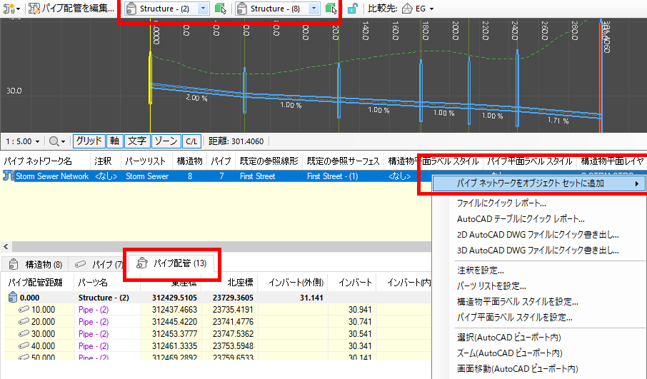 - メインの Project Explorer ウィンドウの[パイプ ネットワーク]タブを開きます。メイン ツールバーで、パイプ ネットワークの縦断ビューの開始構造物を[Structure - (2)]に設定し、終了構造物を[Structure - (8)]に設定します。これにより、表示されるパイプ配管のパスとルートが決まります。パイプ配管の比較サーフェスを[First Street - (1)]に設定します。