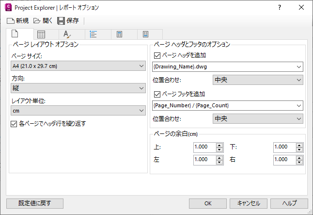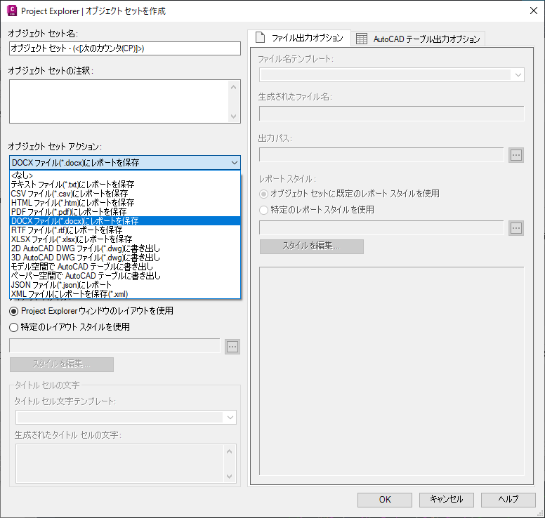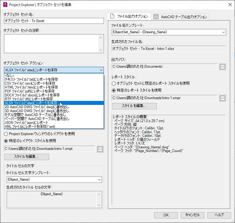 レポートを生成するオブジェクト セットを定義するには、レポートのファイル名、ファイル タイプ、および出力パスを作成し、レイアウト スタイルとレポート スタイルを使用してレポートの内容とレイアウトを設定する必要があります。