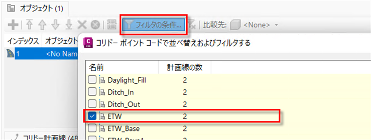 - 必要に応じて、ポイント コード フィルタを追加して、レポートに含めるコリドー計画線を指定できます。[フィルタを追加/編集]ボタンをクリックして、[コンテンツの並べ替えとフィルタ]ダイアログを開きます。ETW ポイント コードを選択し、[OK]をクリックします。