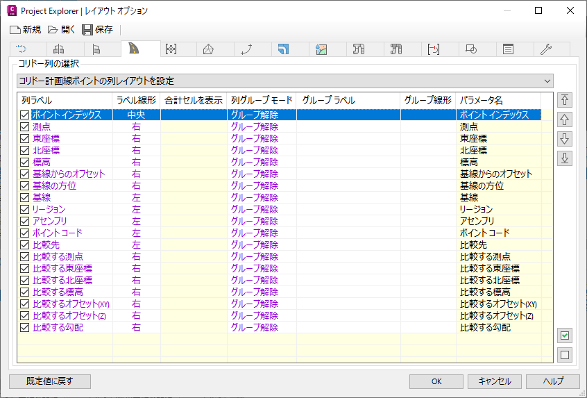 - [レイアウト オプション]ダイアログ ボックスの[コリドー]タブで、[コリドー計画線ポイントの列レイアウトを設定]が選択されていることを確認します。