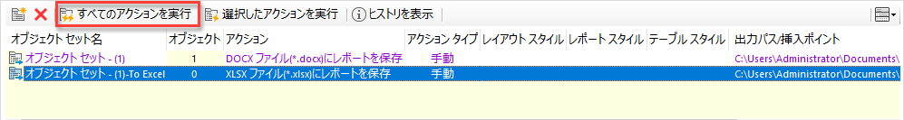- メイン ツールバーの[すべてのアクションを実行]ボタンをクリックします。図面内のすべてのオブジェクト セットからアクションが処理されます。この場合、レポートは DOCX ファイルと XLSX ファイルに同時に書き込まれます。Microsoft Word と Microsoft Excel で、生成されたファイルを確認します。