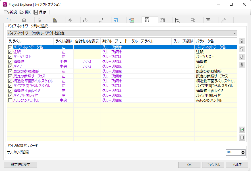 - [レイアウト オプション]ダイアログ ボックスの[パイプ ネットワーク]タブで、[パイプ ネットワークの列レイアウトを設定]が選択されていることを確認します。
