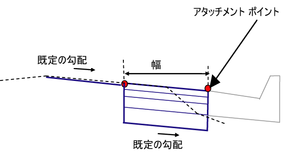 アタッチメント ポイントが、拡幅の外端のオフセットと標高を決定します。拡幅の内端の位置およびオーバーレイの内端の位置は、幅と勾配の指定値を基に決定されます。線形を使用すると、幅の指定値(数値)を変更することができます。オーバーレイ縦断が指定されている場合、勾配は、オーバーレイの内端の縦断標高とアタッチメント ポイントとの間で計算されます。