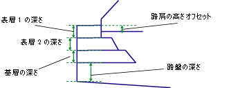 | 左側路盤の深さ | 舗装内側の左端(左側路肩の始点)の路盤層の深さ。路肩の幅をゼロに設定した場合、これは中央分離帯左端の路盤の深さになります。 | 数値 |