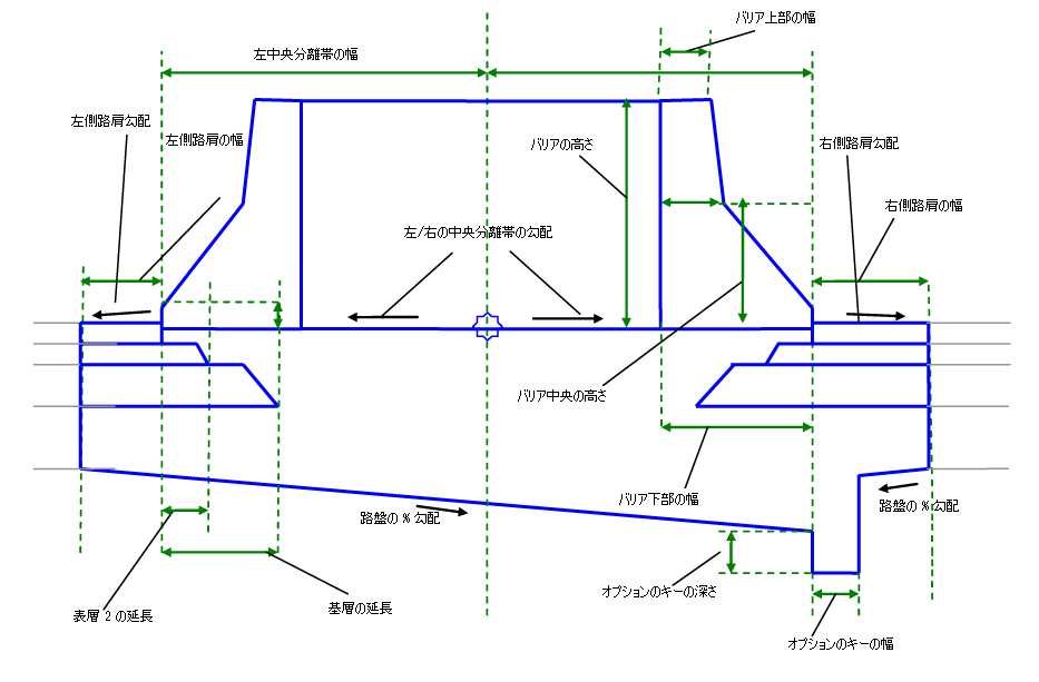 | 路盤勾配 | 各端から中央に向かう路盤の横断勾配。オプションの排水キーを選択した場合は、そのポイントまでの横断勾配となります。 | 数値 | -4% |