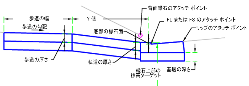 私道全長に歩道が配置されます。私道の勾配は、X 値の距離における縁石すべての高さと歩道の勾配に基づいています。