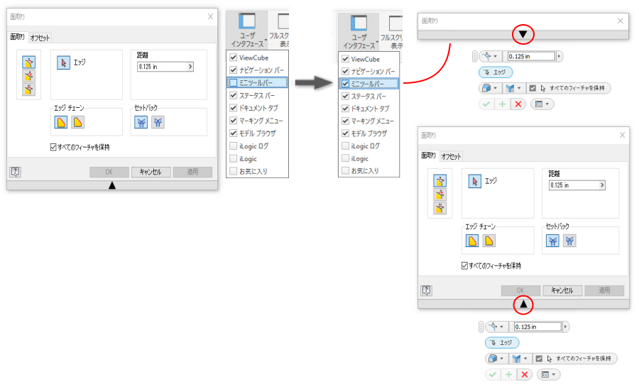 ダイアログ ボックスの側面にミニツールバーが表示できる Inventor ダイアログ ボックスが複数あります。