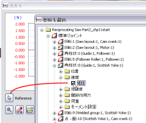 [参照を選択]ダイアログ ボックスで、[標準ジョイント] > [角柱状(ガイド: 1、スコッチ ヨーク : 1)]を展開し、速度フォルダとその内容を表示します。グラフの X 軸の変数として速度を指定するために、Vをクリックします。
