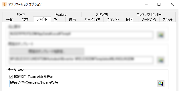 チェック ボックスをオンにすると、Inventor ホーム開始画面の代わりに、指定した Team Web ページを表示することができます。