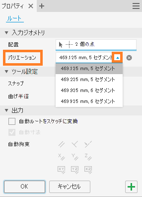 端子ジオメトリを定義して自動ルート領域を作成すると、セグメントの長さと数に基づいて計算された解析が複数存在することがあります。ルートの作成時に使用可能なバリエーションを表示するには、[バリエーション]ドロップダウン矢印をクリックします。