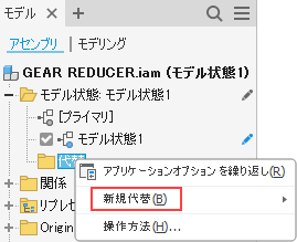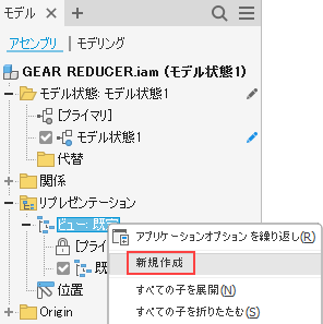 [アセンブリ]モデル ブラウザ内で [リプレゼンテーション] を展開し、 [ビュー] を右クリックし、コンテキスト メニューで [新規] を選択します。
