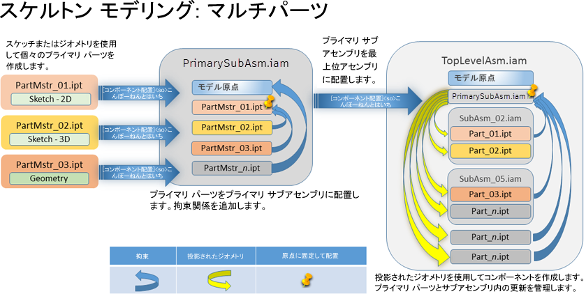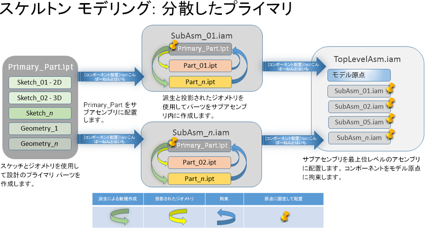 「分散プライマリ」では、スケッチとジオメトリで構成される単一の主パーツを使用して、最終的なアセンブリを定義します。必要に応じて、主パーツをさまざまなサブアセンブリやパーツで参照します。主パーツによってレイアウト全体がコントロールされます。アセンブリとサブアセンブリは主パーツを基準にして定義し、配置します。サブアセンブリはそれぞれ独自のスケルトンを持ち、自身の中で設計の一部分を処理します。上位のスケルトンは、アセンブリ全体のレイアウトやメカニズムの処理に使用します。一方、下位のスケルトンは、パーツのジオメトリの処理に使用する場合があります。