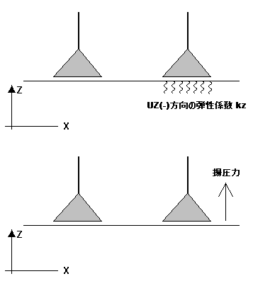 拘束の揚圧力(Z 軸の方向に基づいた揚圧力、すなわち UZ+ など)を定義すると、各拘束の弾性基準係数も決定できます。弾性基準係数は、揚圧力に対して定義された方向と反対方向(すなわち UZ-)に対してのみ決定されます。次の図を参照してください。