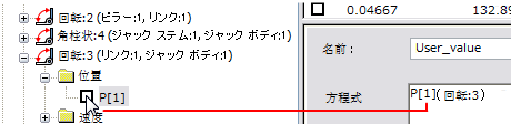 例 | 10+cos(P[1] (回転: 1) - PI/6)+20*abs(P[3] (球状: 2)) 説明 P[1] (回転:1)は、「回転:1」という名前が付いたジョイントの 1 番目の自由度の位置です。 P[3] (球状:2)は、「回転:2」という名前が付いたジョイントの 3 番目の自由度の位置です。 注: 変数を入力するために、[出力グラフ]ブラウザ で変数の左にあるチェック ボックスをオンにします。 |