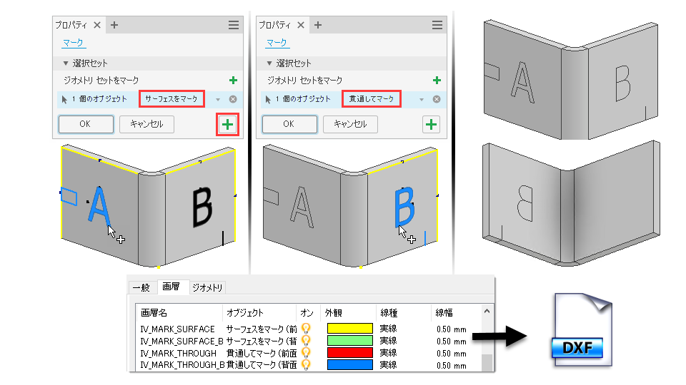 [マーク]コマンドを使用して、レーザー マーキング、エッチング、および彫り込みフィーチャを面に追加します。